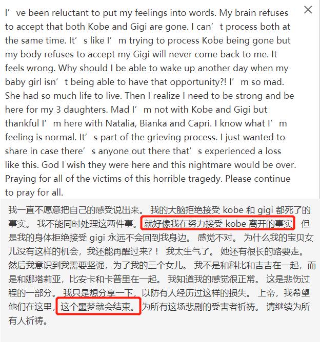 从她的发文中可以看出,她在努力的接受事实,但是又对亲人的去世非常不甘,不过毕竟人死不能重生,自从科比和女儿去世后,瓦妮莎一直在试着接受这个事实,但是可以想象,她一定在深夜中崩溃过很多次。