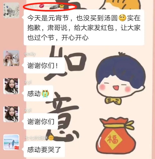 据说元宵节时,因物资匮乏没买到汤圆的凌潇肃唐一菲,还在武汉医护群里发了红包。