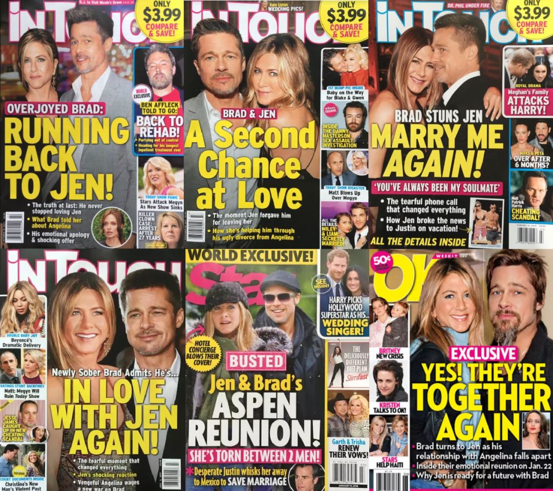只要詹妮弗和男朋友的关系出现一点问题,“詹妮弗不能忘记皮特,那个男人只是皮特的替身”。 朱莉独自出门,身边没有皮特,杂志标题一定是“皮特后悔了,他还爱着前妻”。