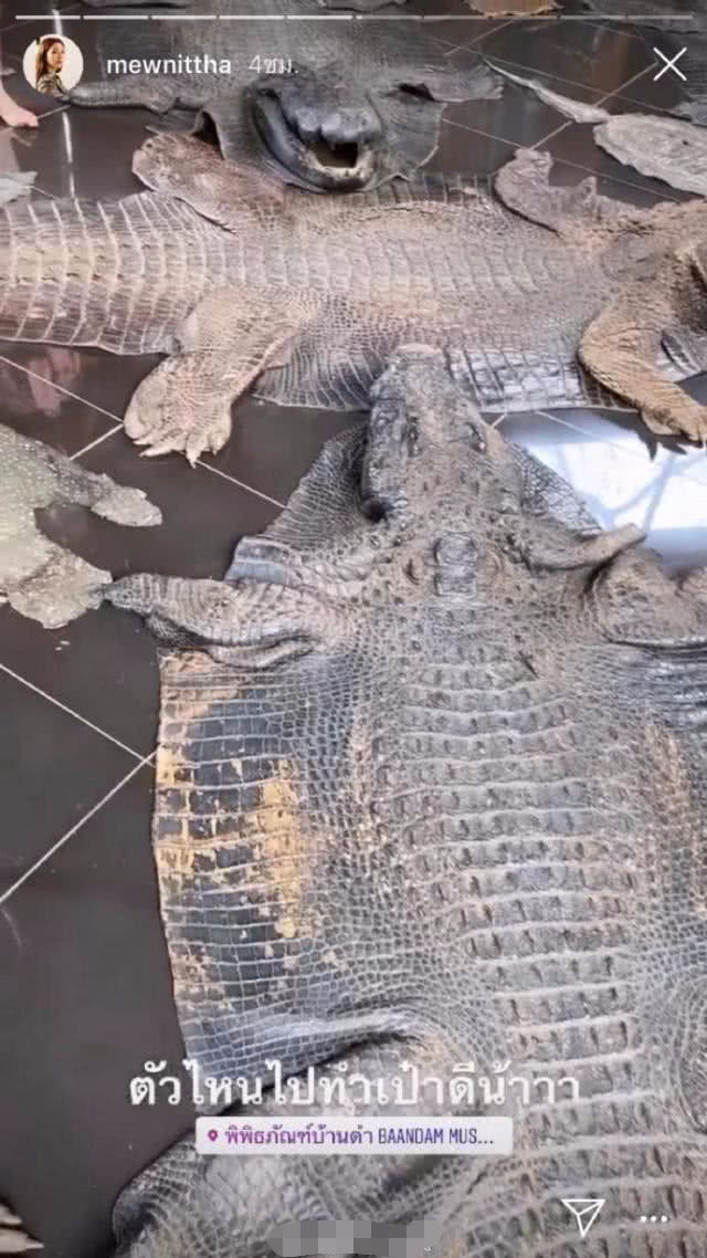 但日前Mew Nittha的一则动态却翻车了,她晒出了一张看起来异常诡异的鳄鱼皮照片,鳄鱼张大着嘴巴,看起来在非常痛苦,像是在进行绝望的呼救,然而并没有人在意它们的感受以及死活,它们就以这样的极其狰狞恐怖的姿态被人了结了生命。在鳄鱼皮尸体的照片中还夹杂着Mew Nittha看起来略微兴奋的提问:“用哪一片(做包)好呢?”实在无法想象这么美丽的人是怎么从嘴里风轻云淡的吐出如此残忍的话。