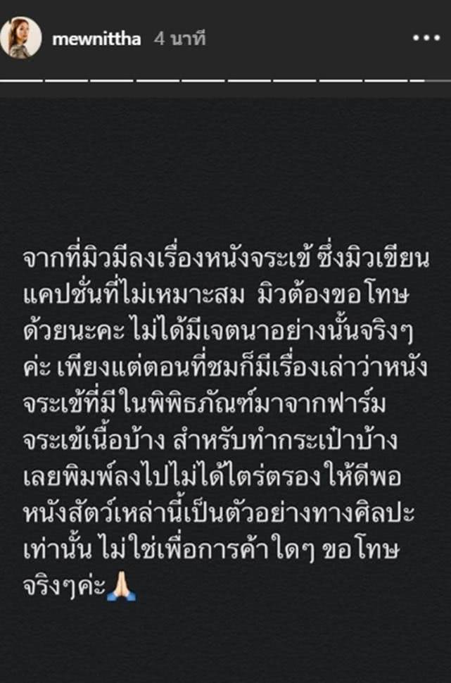 在一片谩骂声中,Mew Nittha也意识到问题的严重性,在社交平台上发文道歉,表示自己没有炫耀的意思,这些动物皮只是艺术上的例子,不是出于商业目的,真的十分抱歉。