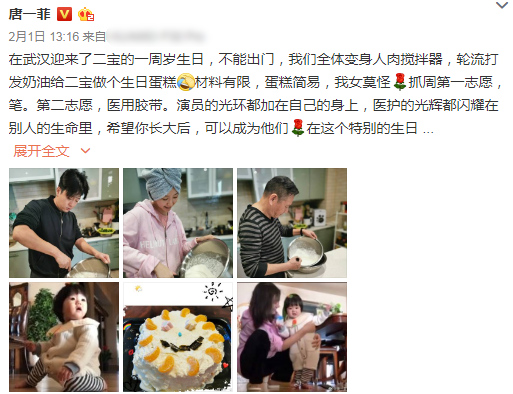 凌潇肃和唐一菲二人虽然身在武汉,但依然保持这积极的心态,还挑战起了高难度甜品。2月1日,两人的小女儿迎来了一周岁生日,但在武汉不便出门,于是全家人变身为“人肉搅拌机”,自己动手打发奶油给二宝做了个生日蛋糕,一家人齐心协力克服困难,何尝不是一种幸福。