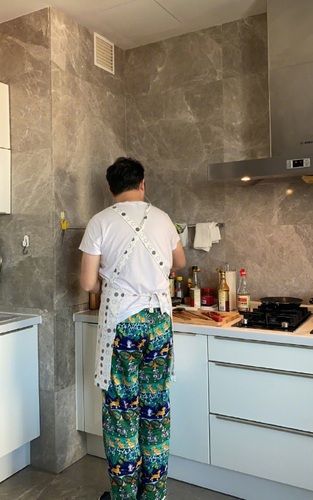 照片中,沙溢打扮十分花哨,下身穿着印花睡裤,腰间还系着波点围裙,完全是一位“厨娘”的既视感,十分接地气。从背影看,沙溢的脖子变粗了不少,白白胖胖的胳膊也十分抢镜,看来宅在家的天数久了,沙溢也和广大网友一样,扼制不住体重蹭蹭往上涨。