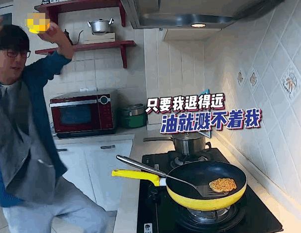 相比之下,何炅下厨就不是那么顺利了。作为一个常年赶通告的大忙人,何老师对厨房并不是十分熟悉,操作起来手忙脚乱,在摄像机镜头前都很难掩饰自己对油锅的恐惧,为了躲油滴差点出框,惊慌失措的反应非常可爱。