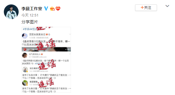 2月10日,李晨工作室发布图片,辟谣营销号所发的相关不实传闻。据悉,近日某些营销号发布关于《盘点李晨5位前女友》等造谣文章,内容严重不实,引发了网友们的热议。