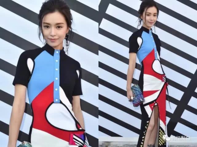 同年的LV春夏大秀上,她又穿了一身款式差不多的色彩拼色长裙,一样很吸引人。