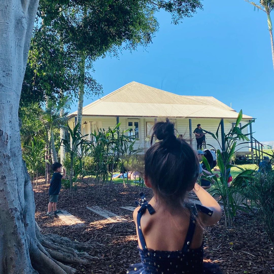 照片中小周周站在一棵大树下,穿着吊带裙,扎着丸子头,手臂纤细,背影看起来潮范儿十足。弟弟罗密欧穿着短袖短裤在招手,站姿超萌。