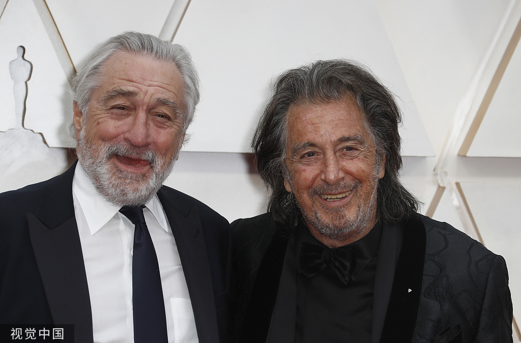 《爱尔兰人》主演阿尔·帕西诺与罗伯特·德尼罗红毯合影,帕西诺将角逐最佳男配角奖。