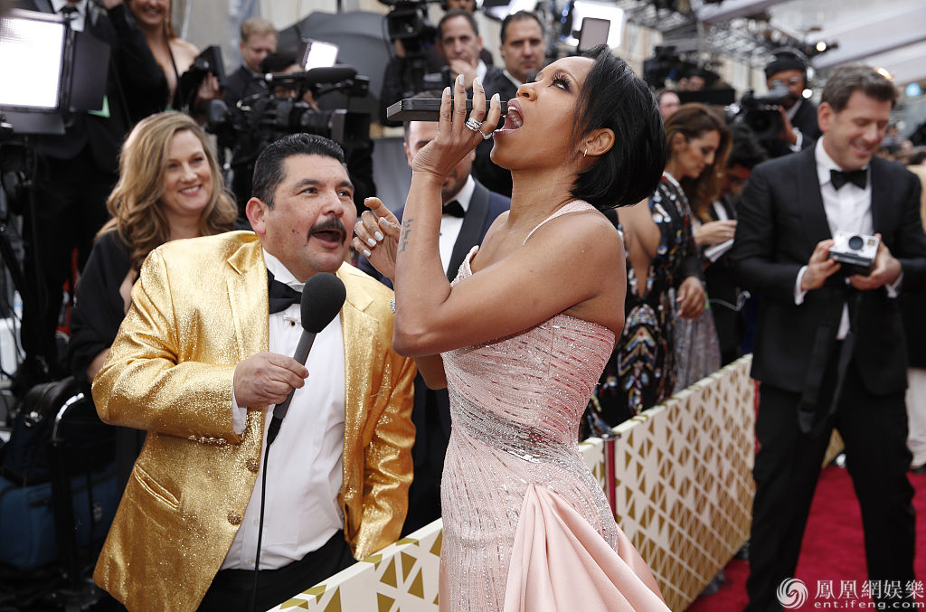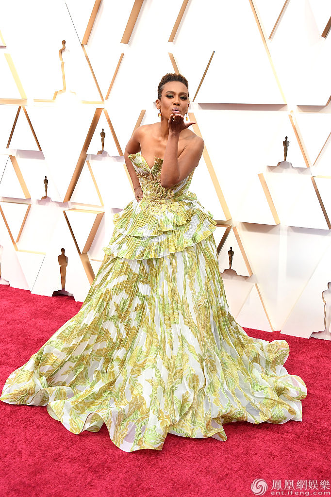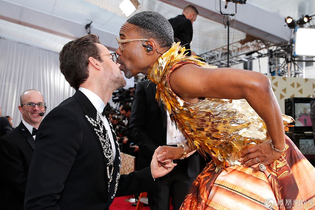 当地时间2020年2月9日,好莱坞,第92届奥斯卡颁奖礼红毯。比利·波特担任主持人亲吻男星脸颊互