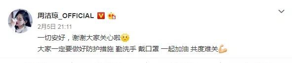 消息传出后粉丝们都很担心,昨天晚上周洁琼发文报平安,表示:“一切安好,谢谢大家关心啦。”
