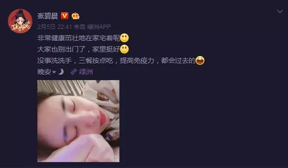同样度过病毒潜伏期的张碧晨昨天也发了博,称自己非常健康茁壮地在家宅着呢。