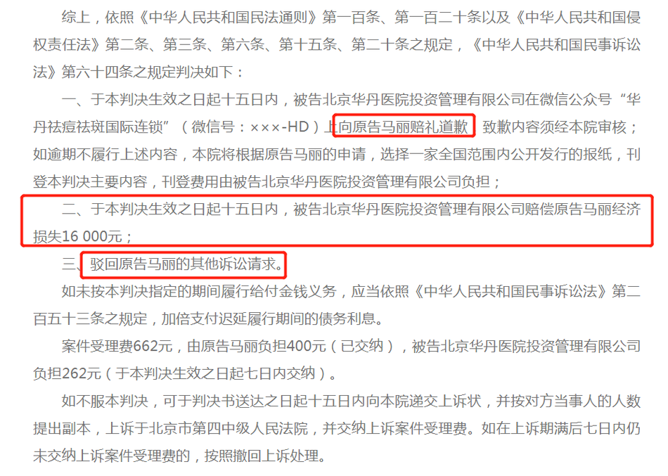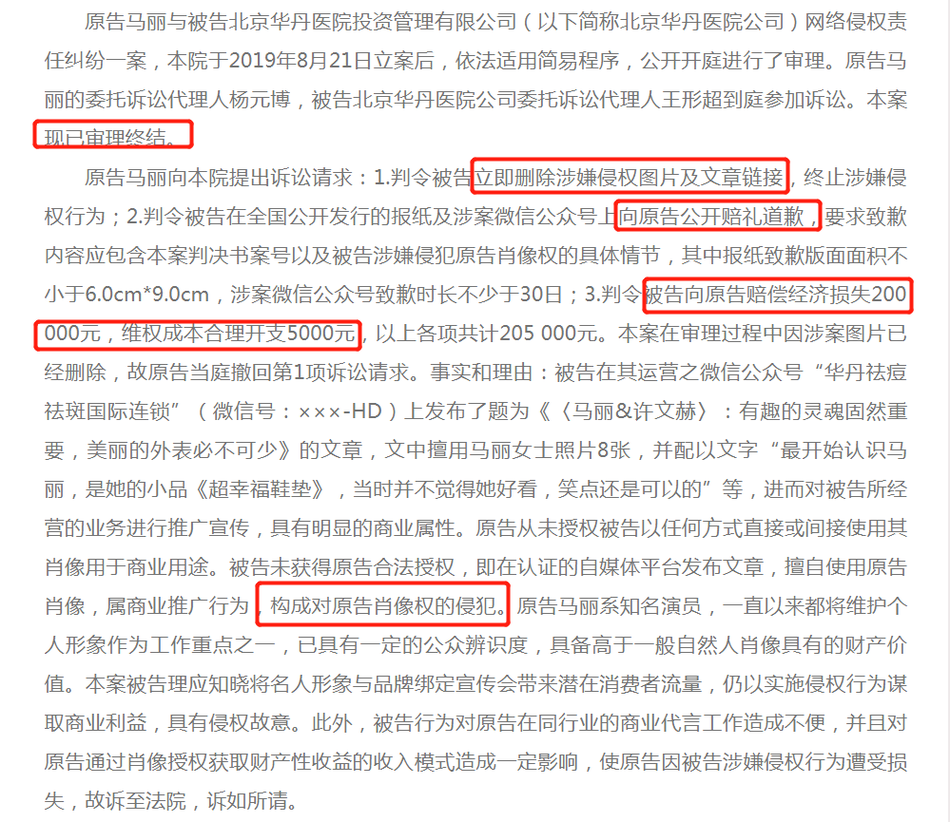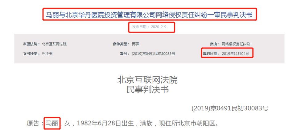 2月9日,北京互联网法院公布了之前马丽与北京华丹医院投资管理有限公司就后者用马丽照片用于商业宣传这一网络侵权责任纠纷一案的判决,裁判结果马丽胜诉,要求被告在其微信公众号上发表致歉声明向马丽赔礼道歉,并赔偿经济损失1.6万元,驳回原告马丽的其他诉讼请求。