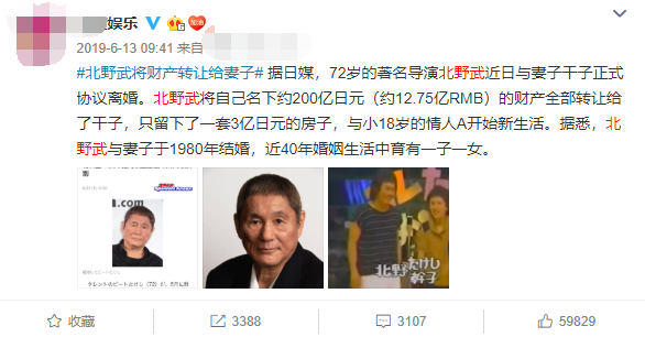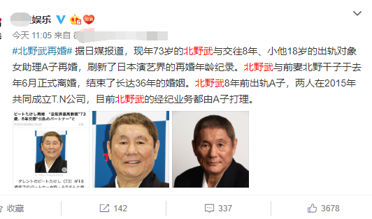 据悉,北野武2012年就跟女助理双宿双飞,并且向妻子松田干子提出离婚,可是松田干子不同意,北野武便跟A共同组建公司,并且将事业交给女朋友全权打理,2019年6月,妻子终于答应离婚,两人36年的婚姻走到了头。