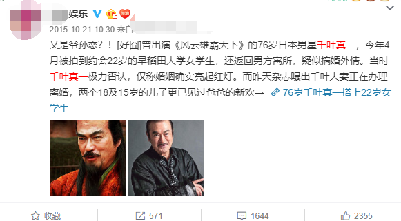 2015年初,76岁的千叶真一跟一位22岁的女大学生玩“爷孙恋”,并且多次被目击于别墅私会,或相约外出旅行,同年跟妻子办理离婚手续,而千叶真一要跟女大学生结婚,不过两人最终没结婚,而是分手了,他的小女友随即嫁人,但不到半年离婚,然后又戏剧性的跟千叶真一复合了。