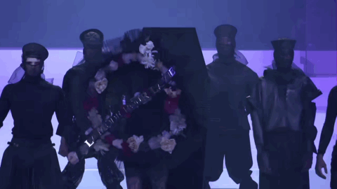 在今年一月份这场告别高定秀上,首先出场的模特躺在棺材里,由几个壮汉抬着出场;