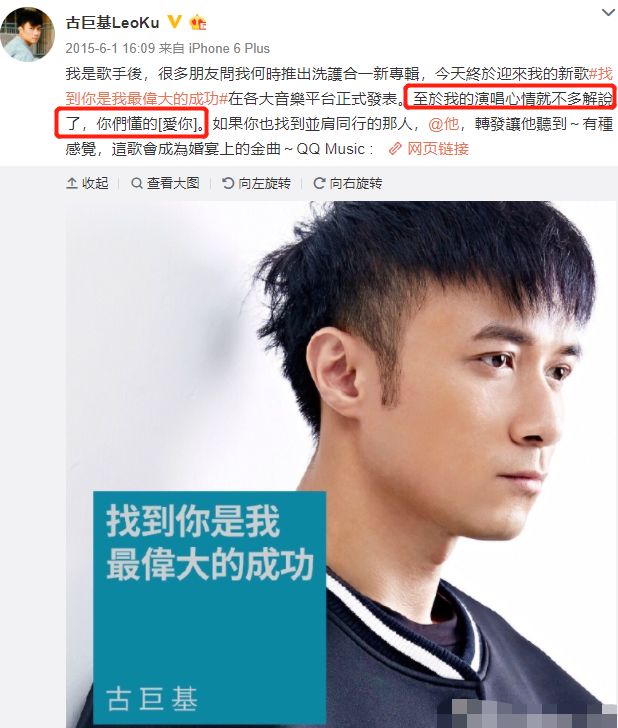 主打歌《找到你是我最伟大的成功》的寓意,古巨基说: 演唱心情就不多说了,你们懂的。