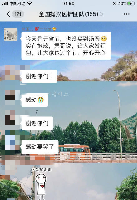 晚上,有网友晒出几张聊天记录,配文:“没想到支援金银潭医院可以有这么美好的遇见,收到唐一菲发的红包”,原来这是唐一菲空降自己武汉医护团队的粉丝群,为群内的医护人员粉丝送上百元红包以及节日的祝福。