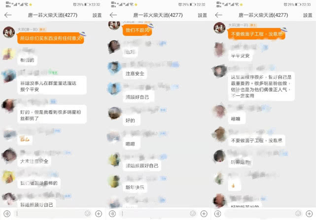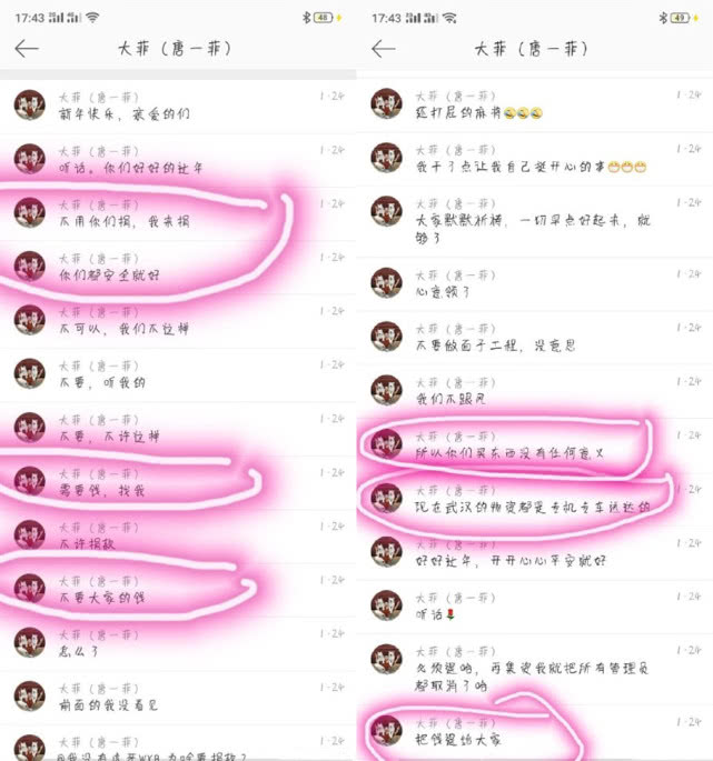 之前唐一菲曾经空降过粉丝群,在群里唐一菲对粉丝说:“所以你们买东西没有任何意义,我们不要跟风,不要做面子工程,没意思。”从其他粉丝的回应看,似乎是因为捐款的事情,唐一菲在劝说粉丝不要捐款。也正是因为唐一菲说了这三句话,被网友截图发了出来,引起质疑。