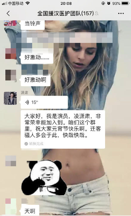 老婆在群内负责发红包,凌潇肃就在群里送上一段语音祝福。唐一菲出生在武汉,在这种情况下还能想到医护人员,果然是人美心善的小姐姐。