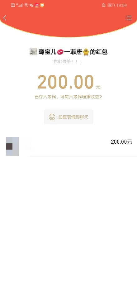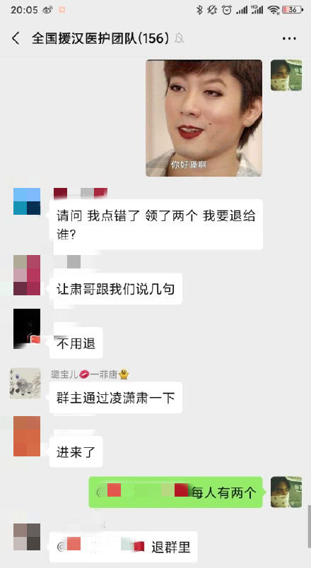 有群内的粉丝表示自己不小心领到了两个红包,想要退掉时才知道,原来唐一菲是给每一位医护人员都发了两个红包,每个红包都有200元,在百元人的群里也是一笔不小的数目。