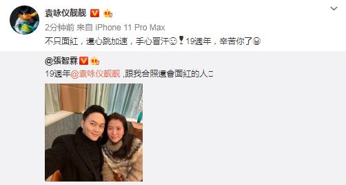 就在8日当天,张智霖也是更新了个人社交动态,圈出老婆袁咏仪的同时并附文写道“19周年,跟我合照还会面红的人”。虽说张智霖的附文极其简单,但每一个字却都道出了他们夫妻间的甜蜜与幸福!