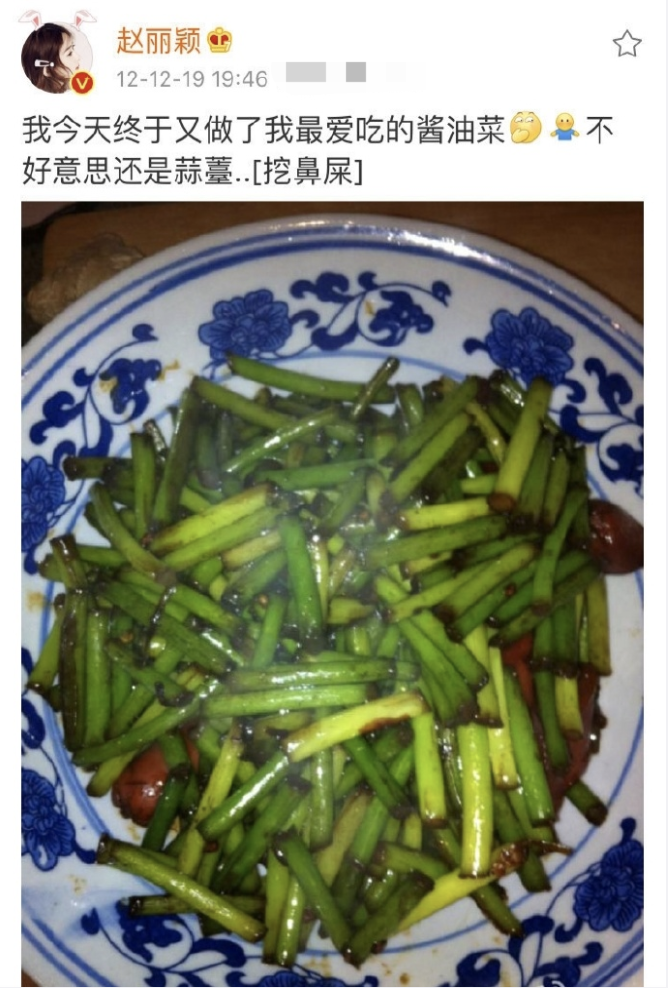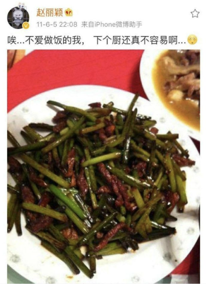 之前赵丽颖自称不爱做饭,炒菜卖相也不好。