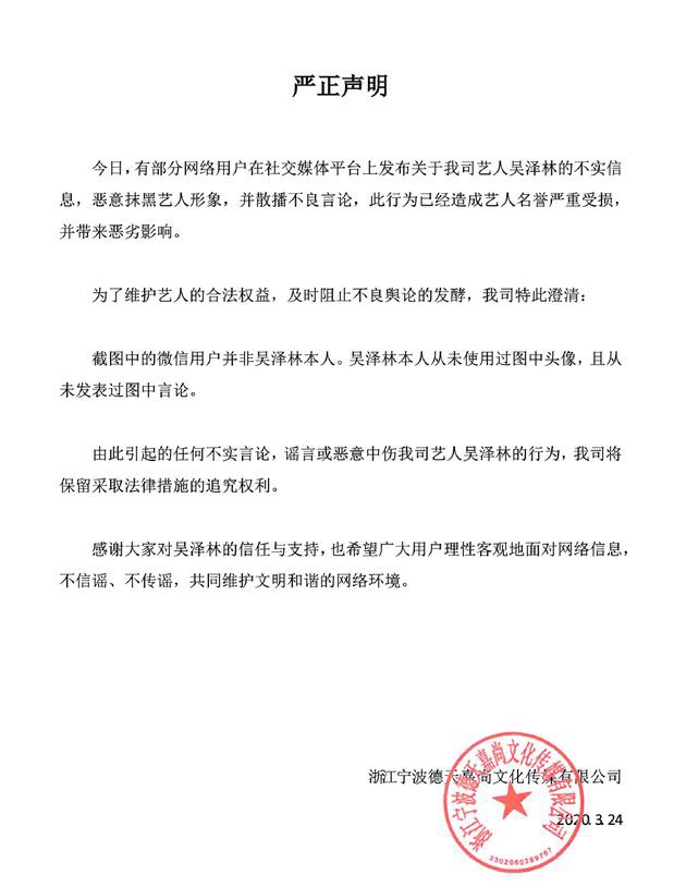 3月24日,嘉尚传媒就网传旗下艺人吴泽林的微信聊天截图及其他相关不实信息发布严正声明,表示:“我司特此澄清:截图中的微信用户并非吴泽林本人。吴泽林本人从未使用过图中头像,且从未发表过图中言论。由此引起的任何不实言论,谣言或恶意中伤我司艺人吴泽林的行为,我司将保留采取法律措施的追究权利。”