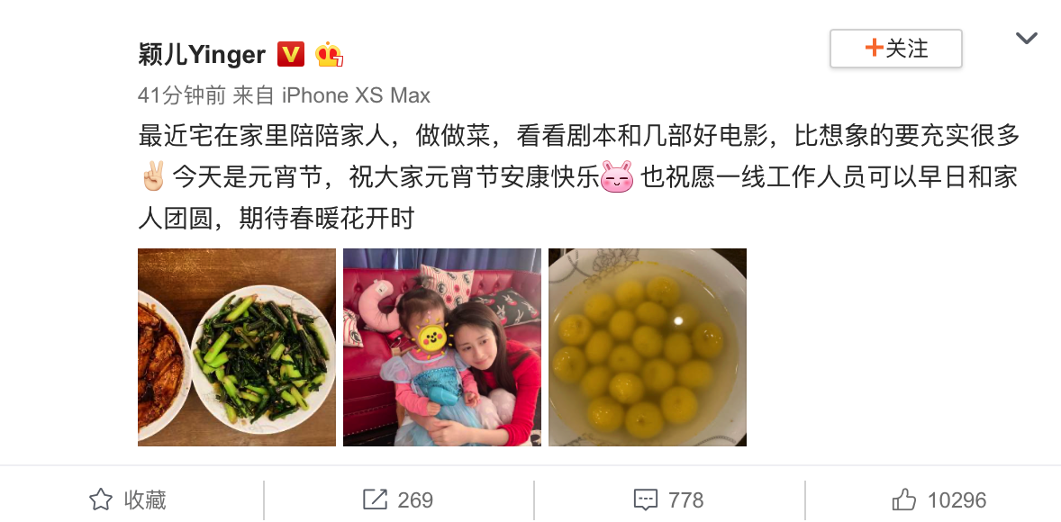 2月8日,颖儿更新动态,称自己近日的行程就是“宅在家里陪陪家人,做做菜,看看剧本和几部好电影”,她还向网友与一线工作人员送上自己的节日祝福,祝一线工作人员“早日和家人团圆,期待春暖花开时”。