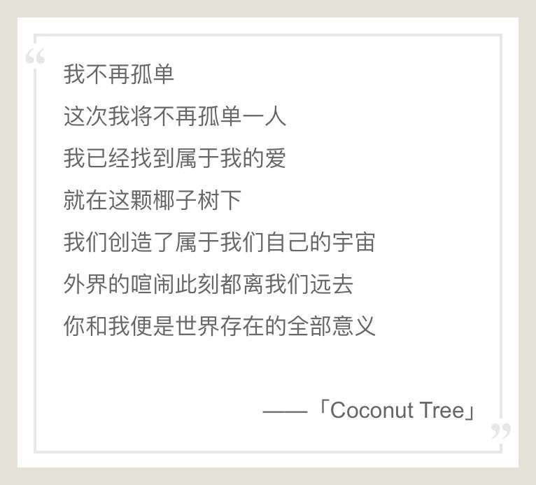后来狼姐还给这段旅程写了首《Coconut Tree》。她说,阳光沙滩大海,我们就依偎着坐在椰子树下聊天看海,那天是我生命中最神奇的时刻。