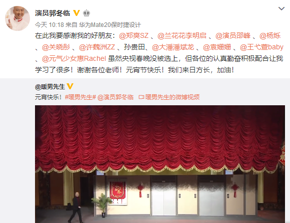 2月8日正值元宵佳节,央视以及各大卫视的元宵晚会都在紧锣密鼓地准备当中。郭冬临今天就晒出了一段自己为春晚准备的小品,虽然没有被春晚选上,但是现在能在元宵佳节一睹为快也是不错的!看看郭冬临感谢的合作演员,郑爽、关晓彤、袁姗姗、惠若琪、许魏洲可都是俊男美女