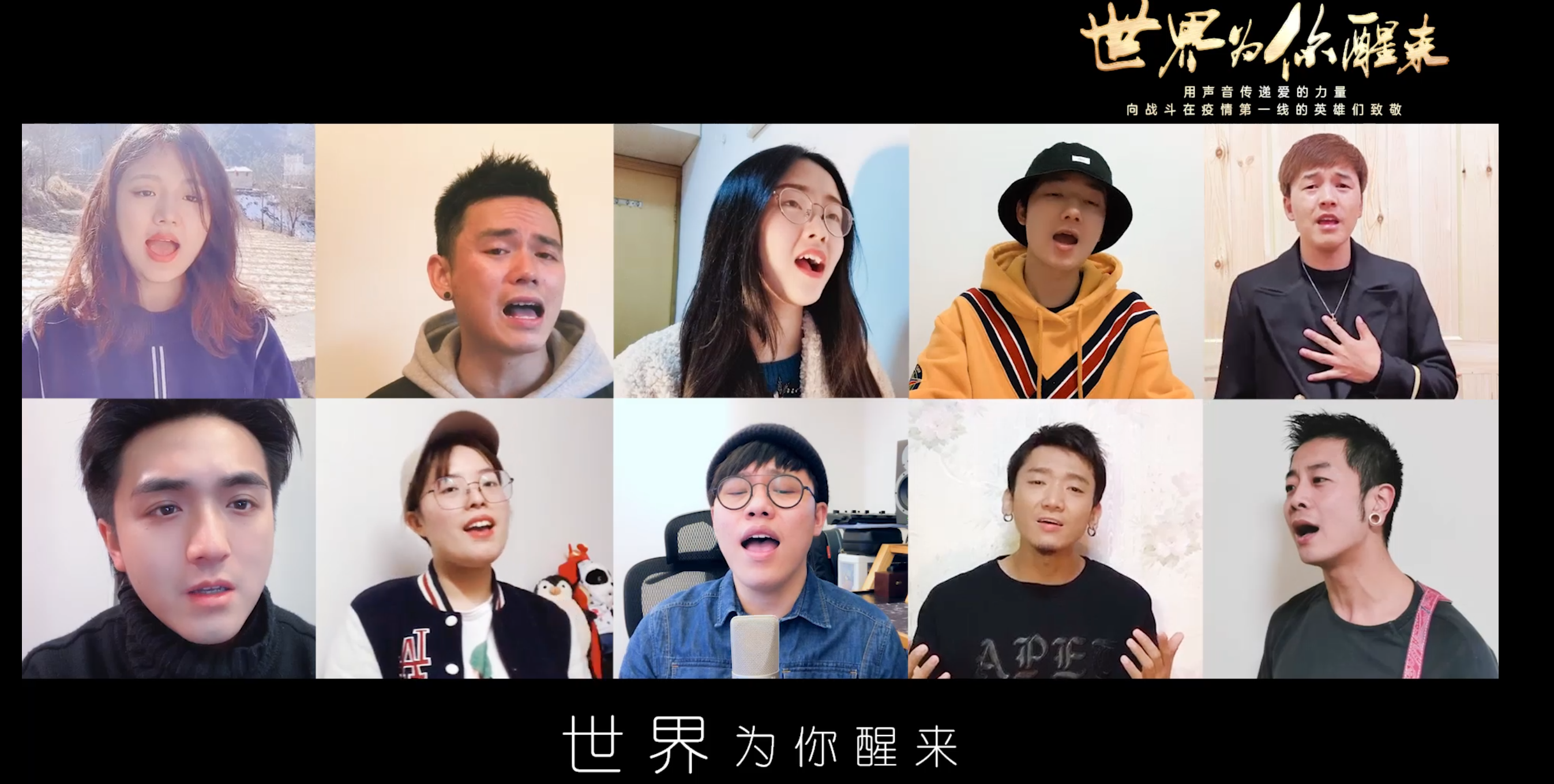 由于当前正处非常时期,所有“好声音”学员们都在自己的家中,由家人辅助或自行完成歌曲的录制和MV的拍摄,家中没有专业录音设备和条件的学员则用手机录制了歌曲并拍摄了MV。所有素材录制完成后,经由互联网发送给负责后期制作和混音的工作人员,歌曲的后期制作和MV剪辑同样也是由相关工作人员各自在家中完成。就这样,来自全国各地的祝福与爱心通过互联网汇聚到一起,诞生了这首《世界为你醒来》。歌曲MV将分五到六个版本分批释出,传递百名“好声音”学员对武汉同胞和全国人民的鼓舞,和中国人民终将战胜疫情的信念。