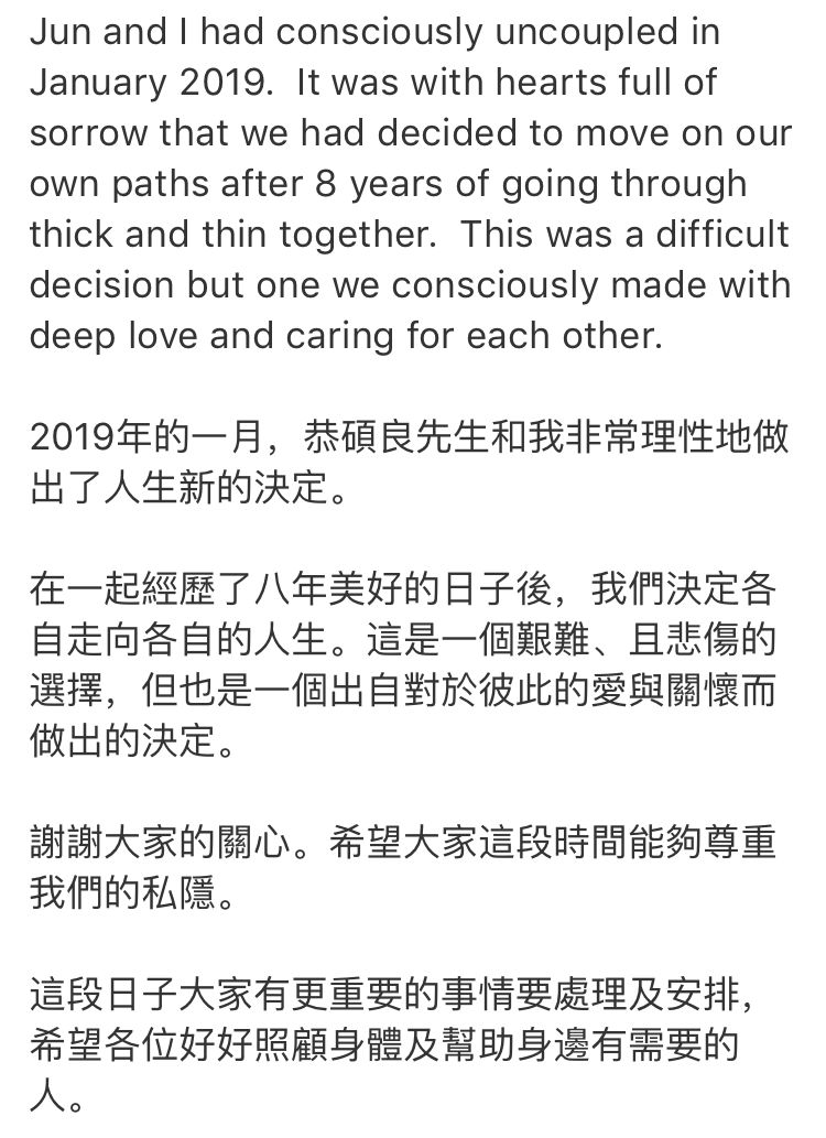 随后林忆莲本人也亲自上传了文章,表示分手是她与恭硕良非常理性地做出的人生决定,是一个出自对于彼此的爱与关怀而做出的决定。