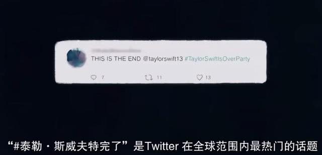 就像那次,世界趋势上出现了话题:“talorswiftisoverparty“(祝贺泰克斯威夫特完蛋),她崩溃了。