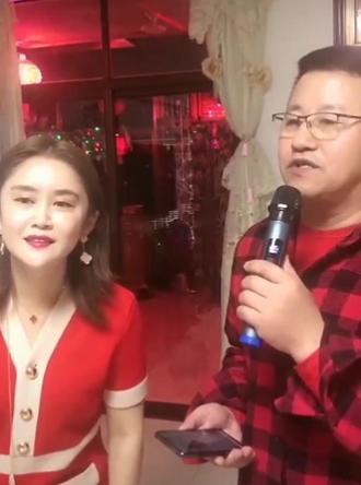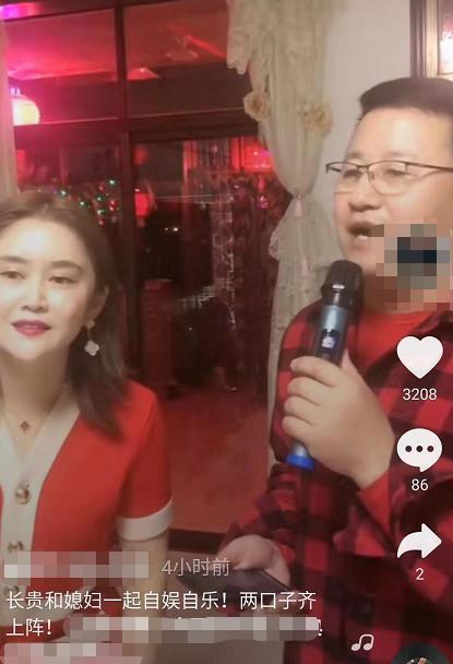而一旁的妻子没有参与老公的演唱,只是一脸微笑的看着镜头随着老公的歌声左右摇晃。
