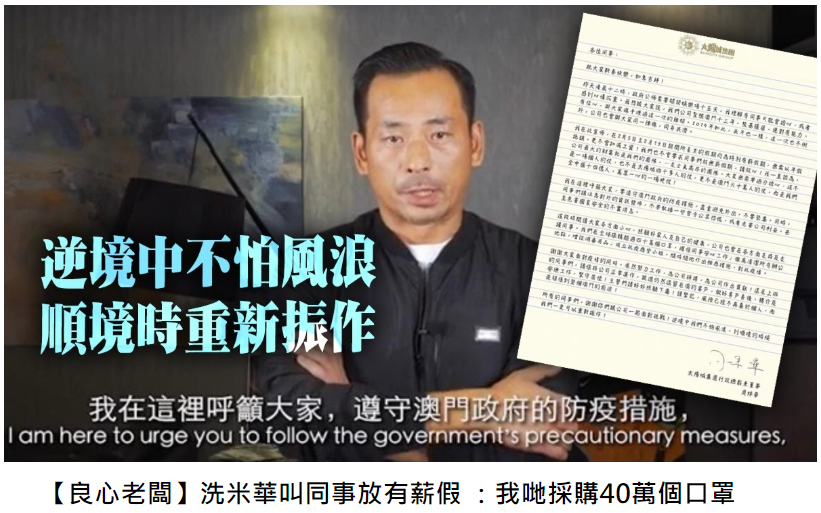 2月7日,洗米华的阔气举动再次让大家为其点赞,因为最近病情情况严峻,所以洗米华作为公司的老板决定,给员工再放14天的带薪年假,并保证不会扣减工资,还采购了40万口罩保证员工健康,被大家点赞“良心老板