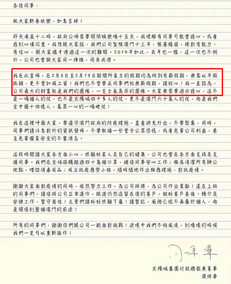 洗米华作为澳门的大老板,自然也是深刻的体会到了这次情况的严重,所以当即做出决定,给员工增加假期,好好待在家减少出门。