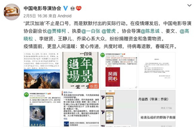 2月6日,中国电影导演协会在微博上发文,文中写道:武汉加油不止是口号,而是默默付出的实际行动。中国电影导演协会副会长贾樟柯、执委管虎,协会导演陈思诚、姜文、高晓松、李继贤、王静儿、乔梁等心系大众,纷纷捐赠资金和急需物资。