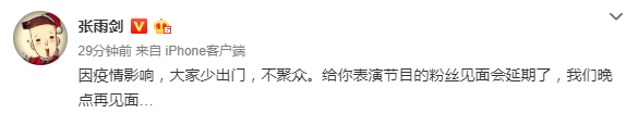 2月7日,张雨剑在社交网上发文宣布粉丝见面会延期,称:“因疫情影响,大家少出门,不聚众。给你表演节目的粉丝见面会延期了,我们晚点再见面… ”