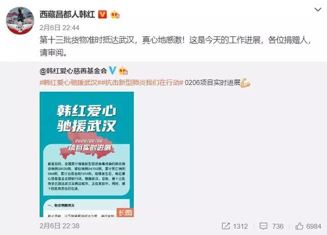韩红也起到了带头作用,所在的爱心慈善基金会目前已经送达十三批到达武汉,并把细节一一公示出来,让各位捐赠人审阅。