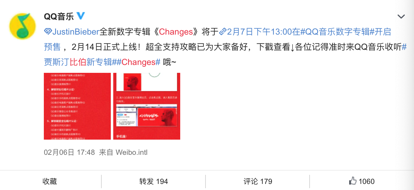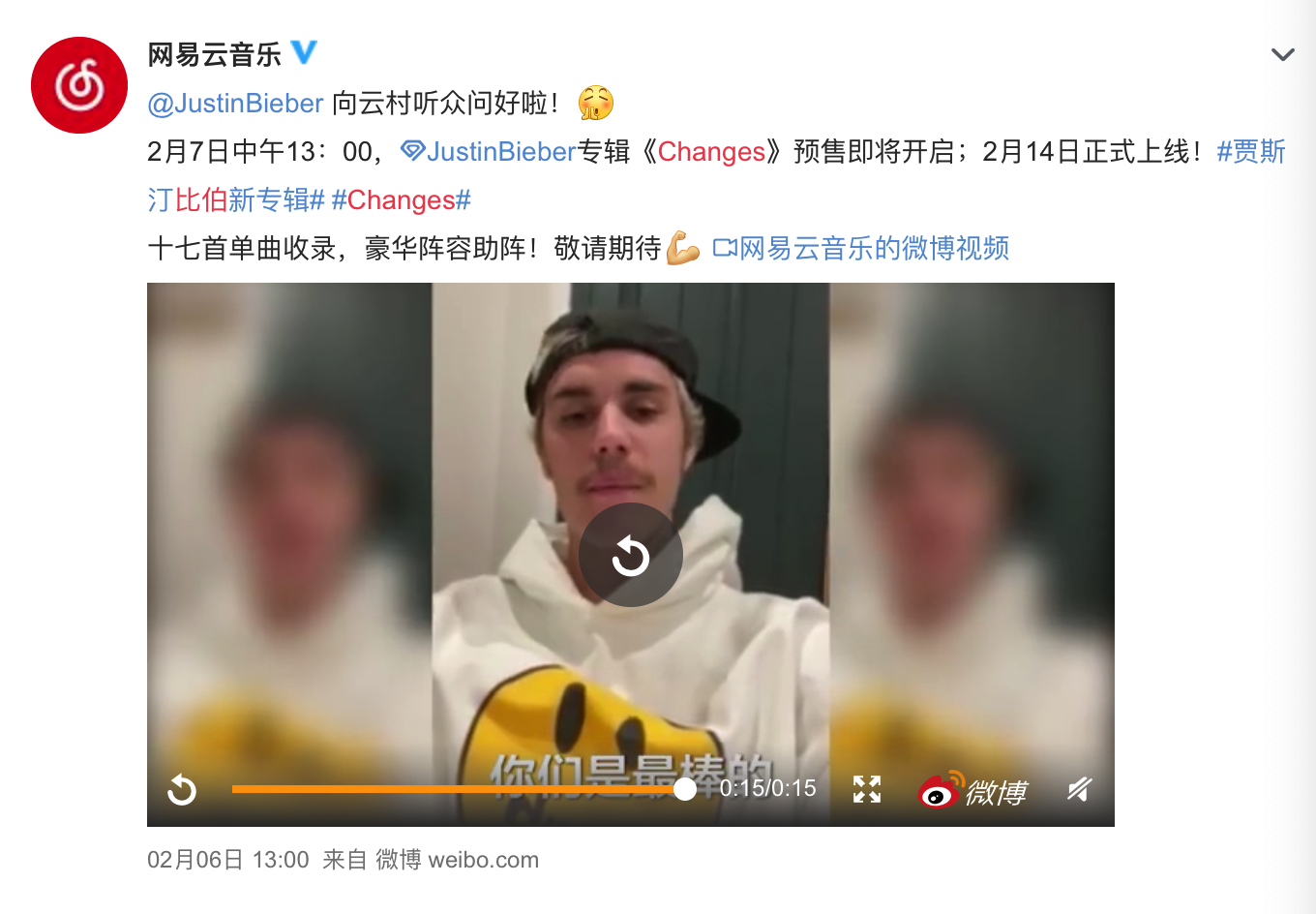 2月7日,贾斯汀·比伯在社交平台发文问候中国的粉丝,同时回应了新专辑预售推迟一事。