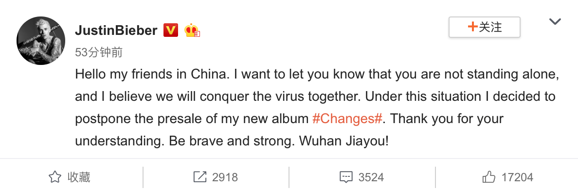 他发文称:“我想让你知道你不是孤军奋战,我相信我们会一起战胜病毒。在这种情况下,我决定推迟我的新专辑《Changes》的预售。谢谢你们的理解。要勇敢坚强,武汉加油!”