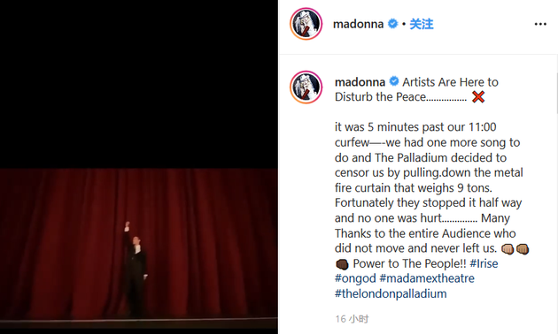 在麦当娜发布的一段视频中,麦当娜爆粗口大骂审查制度,还说“艺人来这里就是为了扰乱和平”,在视频的字幕中,她写道:“我们晚上11点宵禁已经过去五分钟了,还有一首歌要唱,结果剧院居然放下金属防火卷帘,幸运的是他们中途停下了,没有人受伤,非常感谢所有观众他们没有动,他们从没离开我们,权力属于人民!”