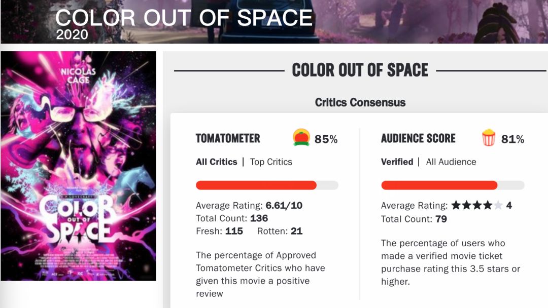 相比之下,这部《星之彩》显然更贴近观众,起码影片起点就不高,一开始就6分多的评分,很低调的默默存在,反倒有可能吸一波关注,帮凯奇打个小小的翻身仗。