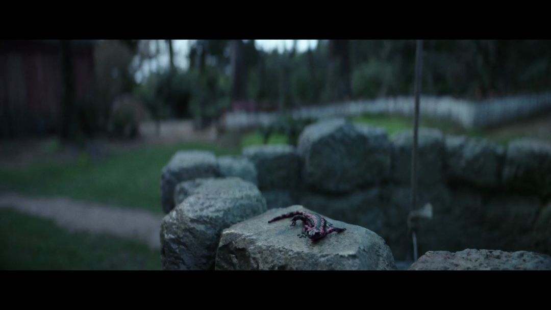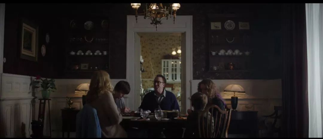 本片色调大概在正常的配色基础上,开始让蓝色和紫色渐渐进入这个故事,比如,我们看女孩头上那一点点的紫色,其实也是对这种神秘力量侵入家庭的色彩暗示。