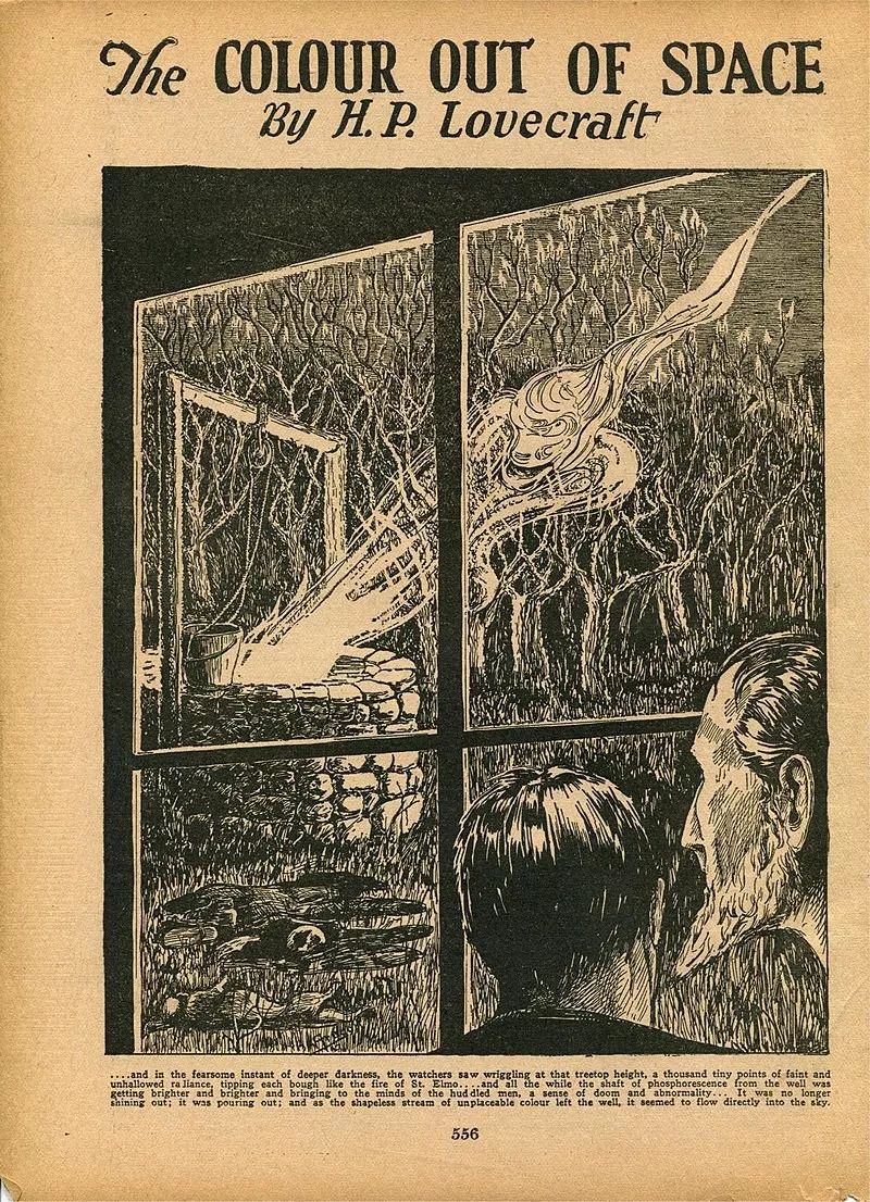 原小说写于1927年,关于一颗陨石落在一个农户家门口,石头闪着奇异的、难以描述的光彩,之后,就消失了。 而这一家,在之后一年多,则被这个陨石所影响,遇到越来越多的怪事情……