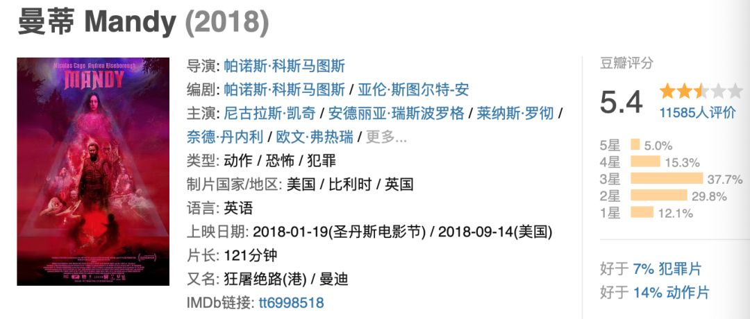 那部当年也是豆瓣神片了,血腥、疯狂、神神叨叨以及抢眼的色彩,一度被认为是凯奇的翻身之作。结果,豆瓣评分从9分多掉到现在的5.4分,也是非常传奇了。