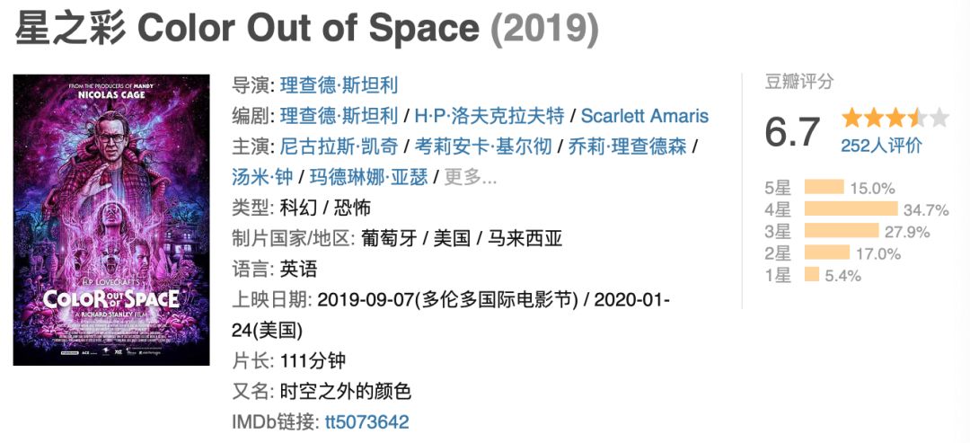 而这部《星之彩》正是来自他的同名短篇小说,又是一个源于神秘、未知的恐怖故事。