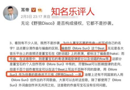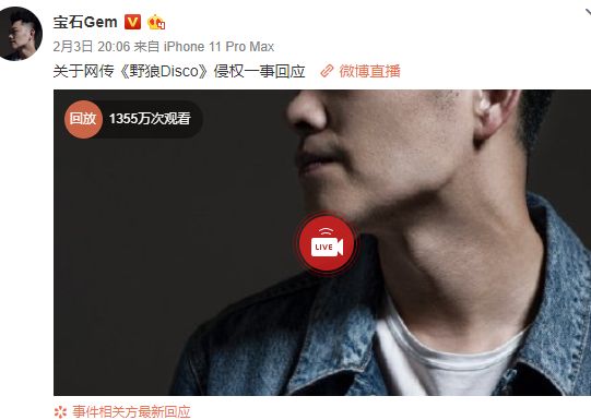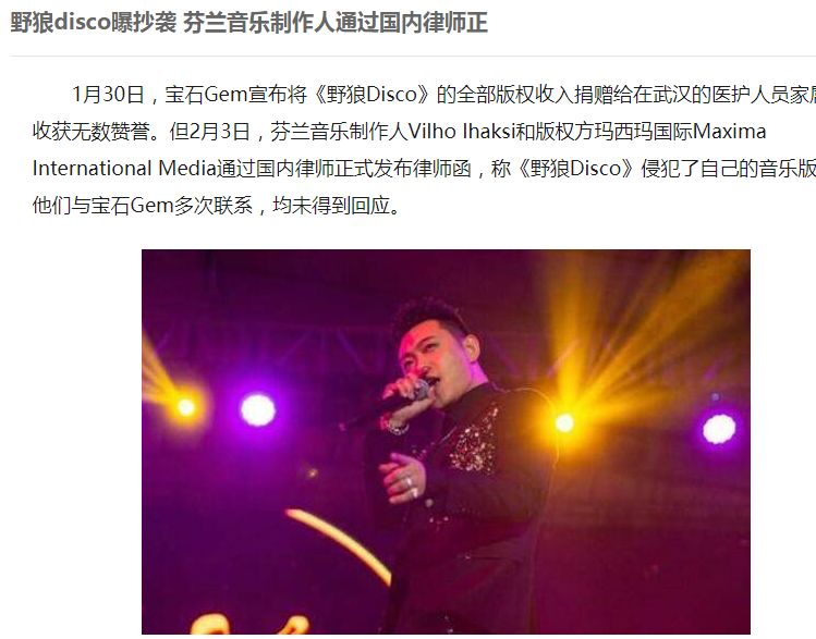 2月3日,某律师忽然发文,表示《野狼disco》侵犯了制作人Ihaksi和目前版权持有者玛西玛国际传媒有限公司的权益。