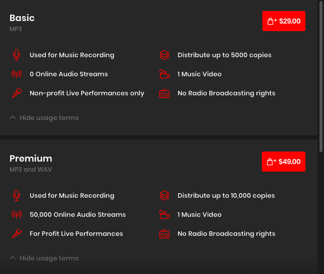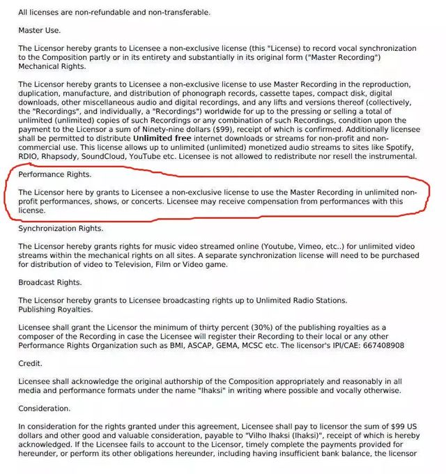 虽然简介里说了可以用于商业演出,但点开条款细节之后,会发现在表演权益这方面,99美元可以享有的只是“unlimited non-profit performance“(无限制次数的非盈利演出),而这个一般人不会细看的部分,很有可能就会成为埋下的“侵权雷”——