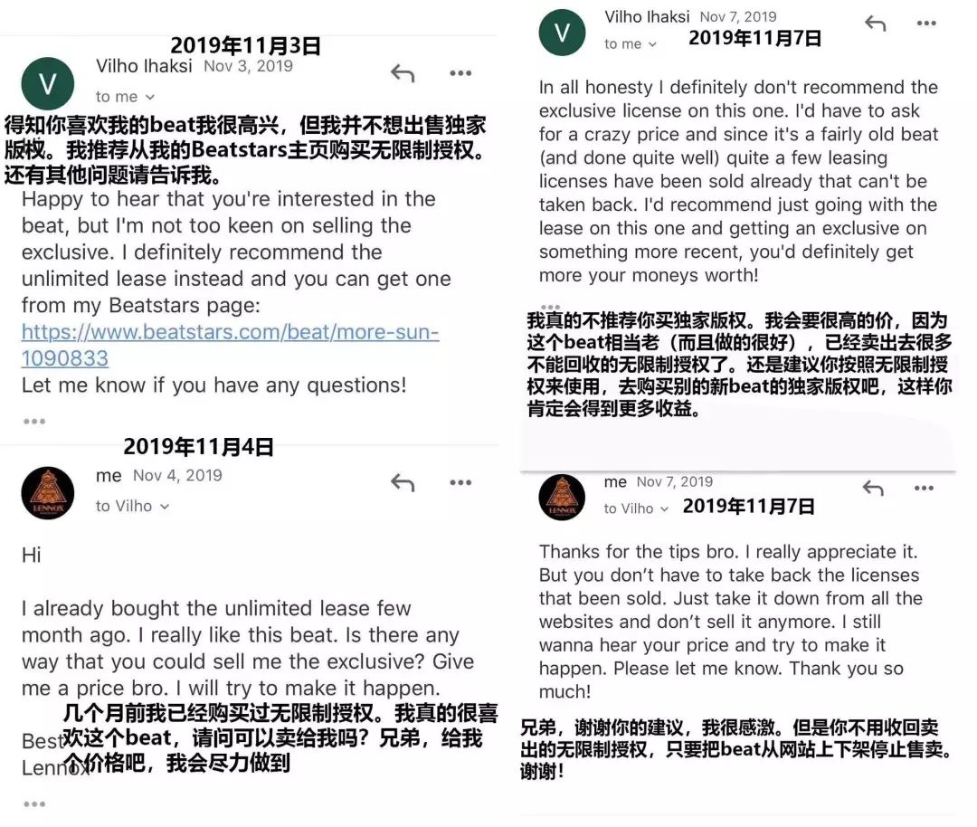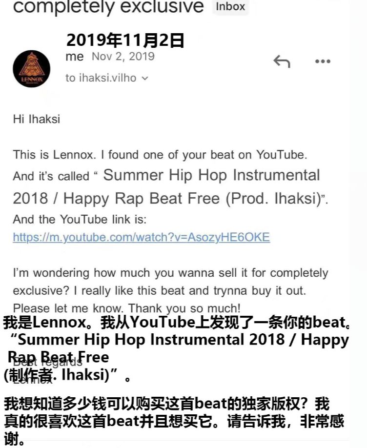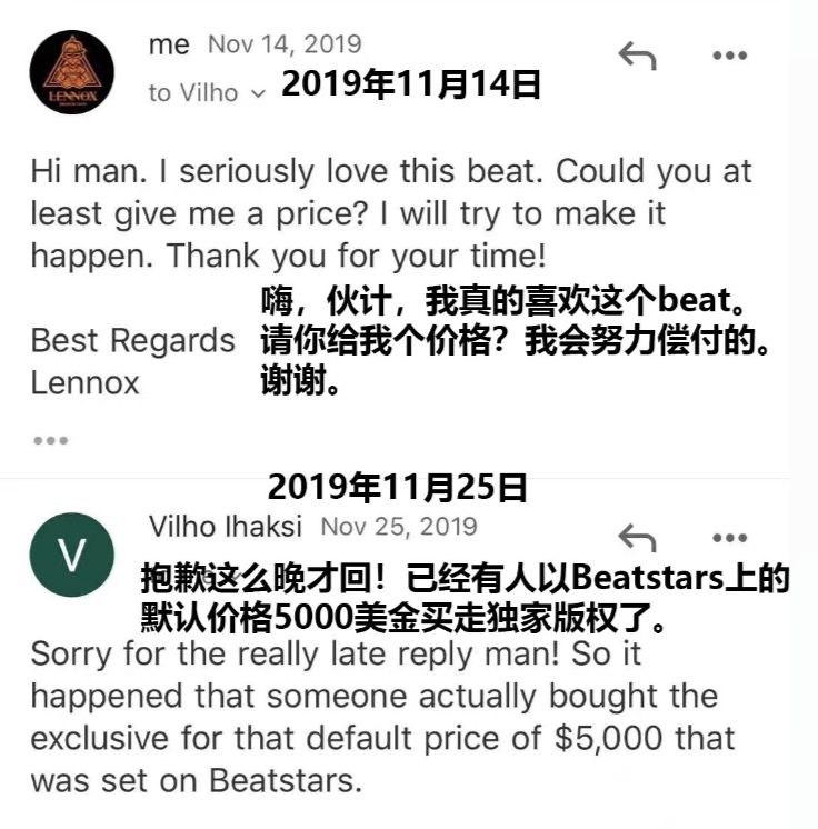 明明已经为了独家授权给足了诚意,但两周后,Ihaksi表示,称两人交涉的时候,已经有人以5000美金买走了这首Beat的独家版本。